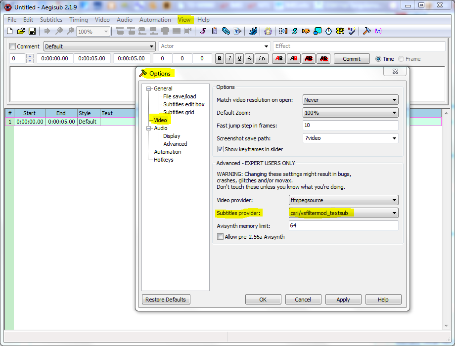 Öncelikle aegisub un kurulu olduğu dizine girip csri adında bir klasör açıp bu klasöre aegisub un kendi geliştirdiği modifiyeli vsfilter-aegisub32.dll dosyasını bu klasöre taşıyalım. şimdi csri loader denilen bir küçük dll dosyamız var bu csri.dll dosyası csri klasöründeki filtreleri yuklemeyi sağlıyor. Aegisub un csri klasöründeki altyazı filtrelerini okuması için bypass etmemiz gerekiyor. Bunu yapmak içinde taşıdığımız. vsfilter-aegisub32.dll dosyasının ismini csri.dll dosyasına vererek aegisub programını aldatmış olacağız. Artık altyazı filtreleri csri klasöründe. Şimdi buraya modifiyeli VSFilterMod.dll dosyasını da kopyaladıktan sonra aegisub menüsünde view-options-video yolunu takip ederek subtitles-provider seçeneğini csri/vsfiltermod_textsub olarak ayarladığımızda işlem tamamdır.